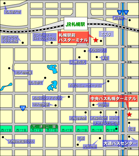 | 全路線共通 | 中央バス札幌ターミナル 011-231-0600 (7:30〜18:00) ただし函館号は7:25、紋別号は6:30、釧路号は8:32から受付 |